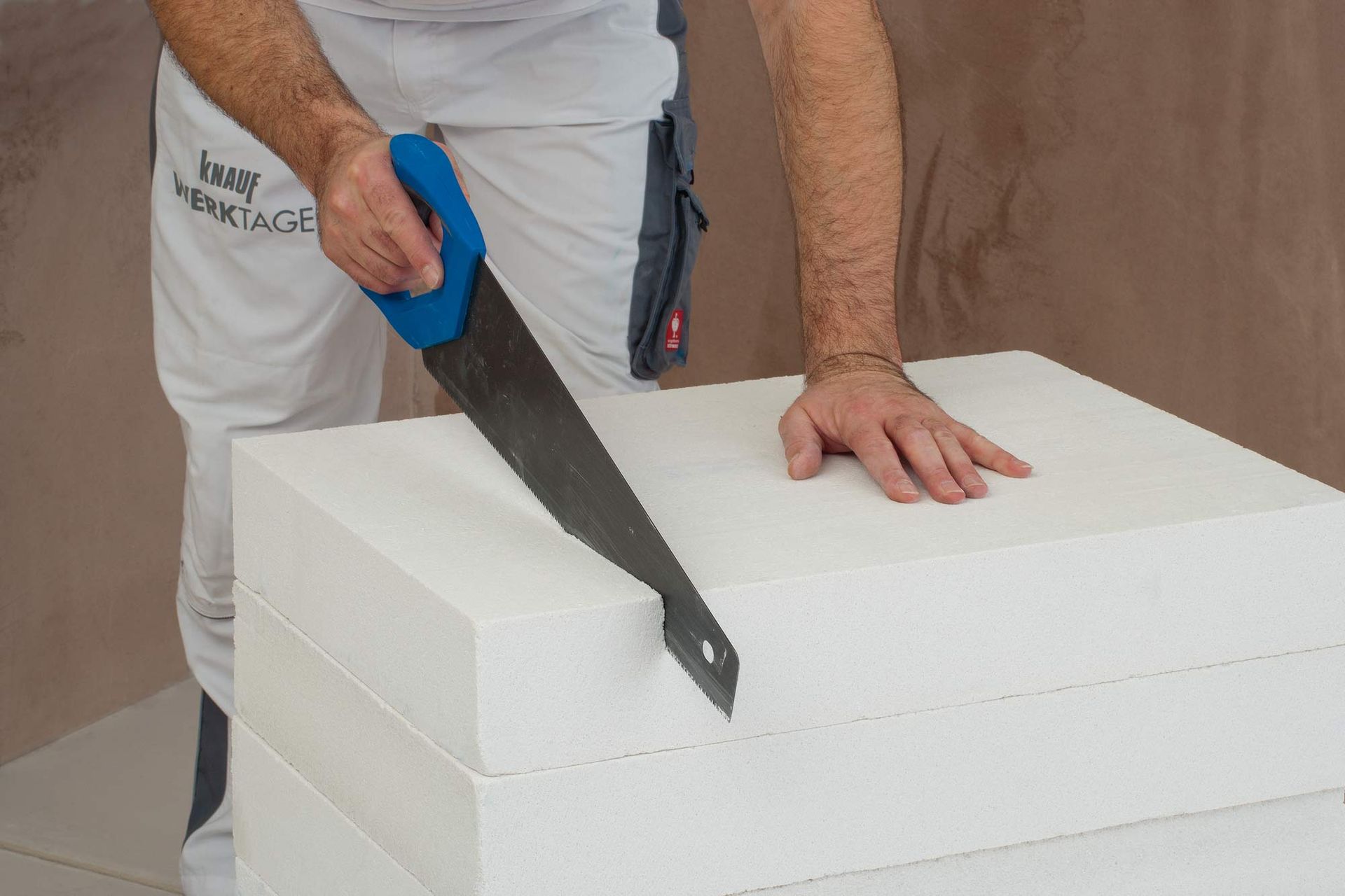Durch ihren hohen "Luftanteil" sind Perlit-Dämmplatten nicht schwer und sie lassen sich einfach auf Maß bringen. Zum Ablängen genügt eine Handsäge. Das Material ist faserfrei und für Allergiker gut geeignet. Foto: Knauf